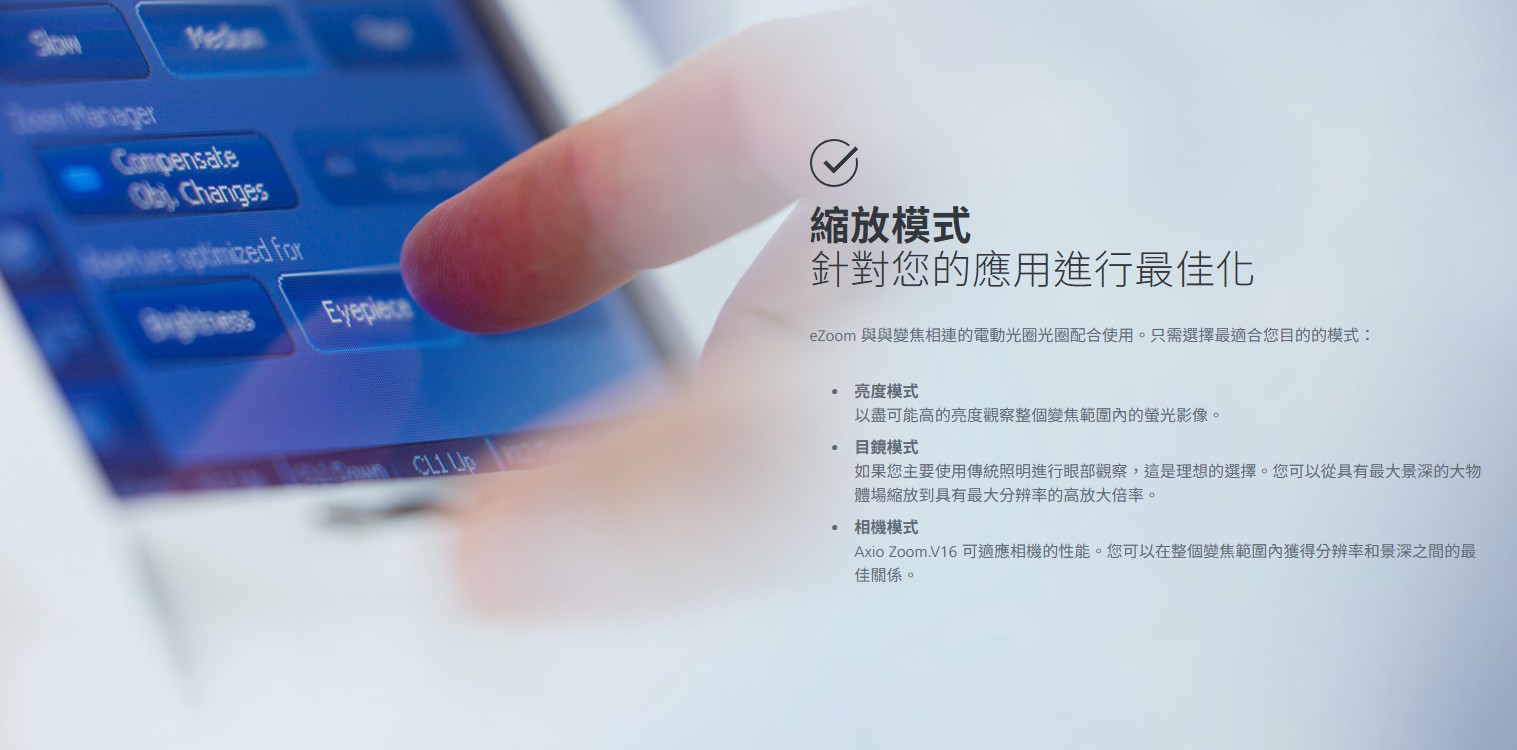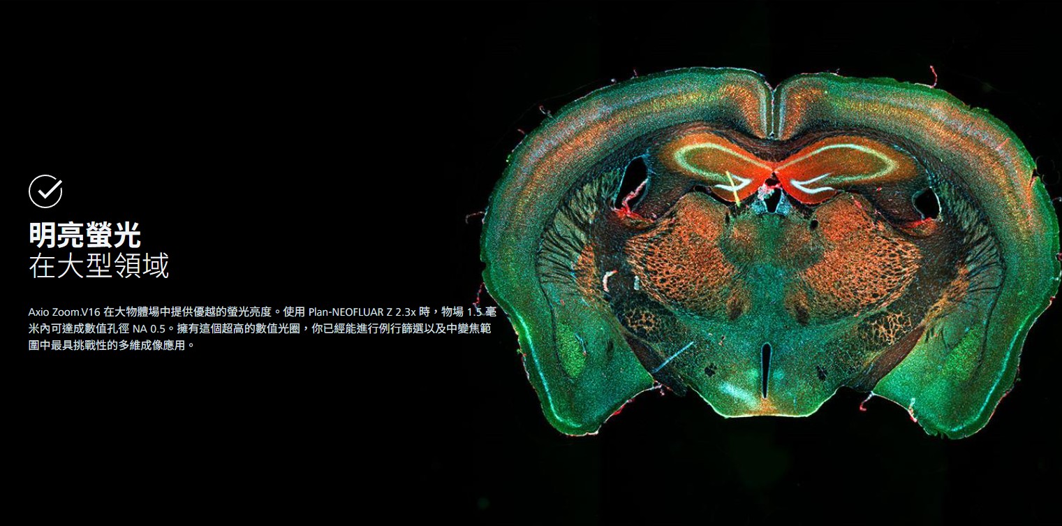 Axio Zoom.V16 結合了 16 倍變焦與高數值光圈 NA 0.25,成為所有已知立體與變焦顯微鏡的領先者。它已經能達到中變焦範圍非常高的光圈。你可以在大範圍物體中獲得更強的亮度,並以螢光對比觀測完整的模式生物。