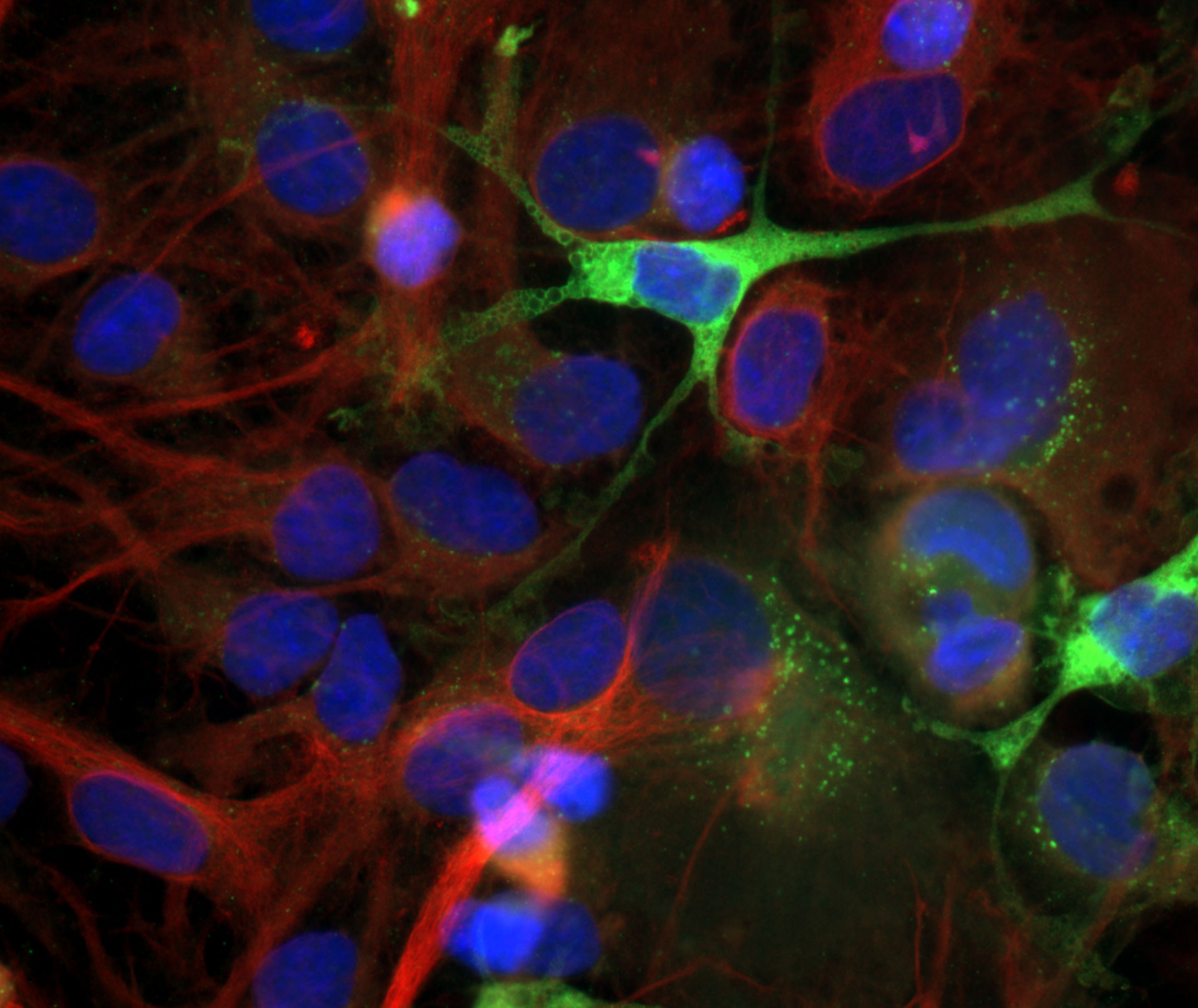 星形膠質細胞 綠色:GFP,紅色:微管蛋白 – Alexa 568,藍色:Hoechst 33342,使用蔡司 Axio Imager.D2 獲取,物鏡:平面遠顯色 63× / 1.4
