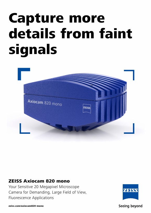 Axiocam 820 單色 2000 萬像素相機配備 17.5 毫米對角背照式 CMOS 大型感測器,峰值量子效率為 86%。結合其低讀出噪聲,這款相機是對活體或固定樣品中微弱熒光信號進行成像的理想選擇。其方形傳感器有效地利用顯微鏡的光學視野捕捉更多細節。雙 USB 3.0 介面可實現最高的擷取速度,而不會犧牲標準化介面的穩健性。Axiocam 820 單色相機的高性能和無與倫比的靈活性使其成為生命科學研究中最具挑戰性的樣品的完美選擇。