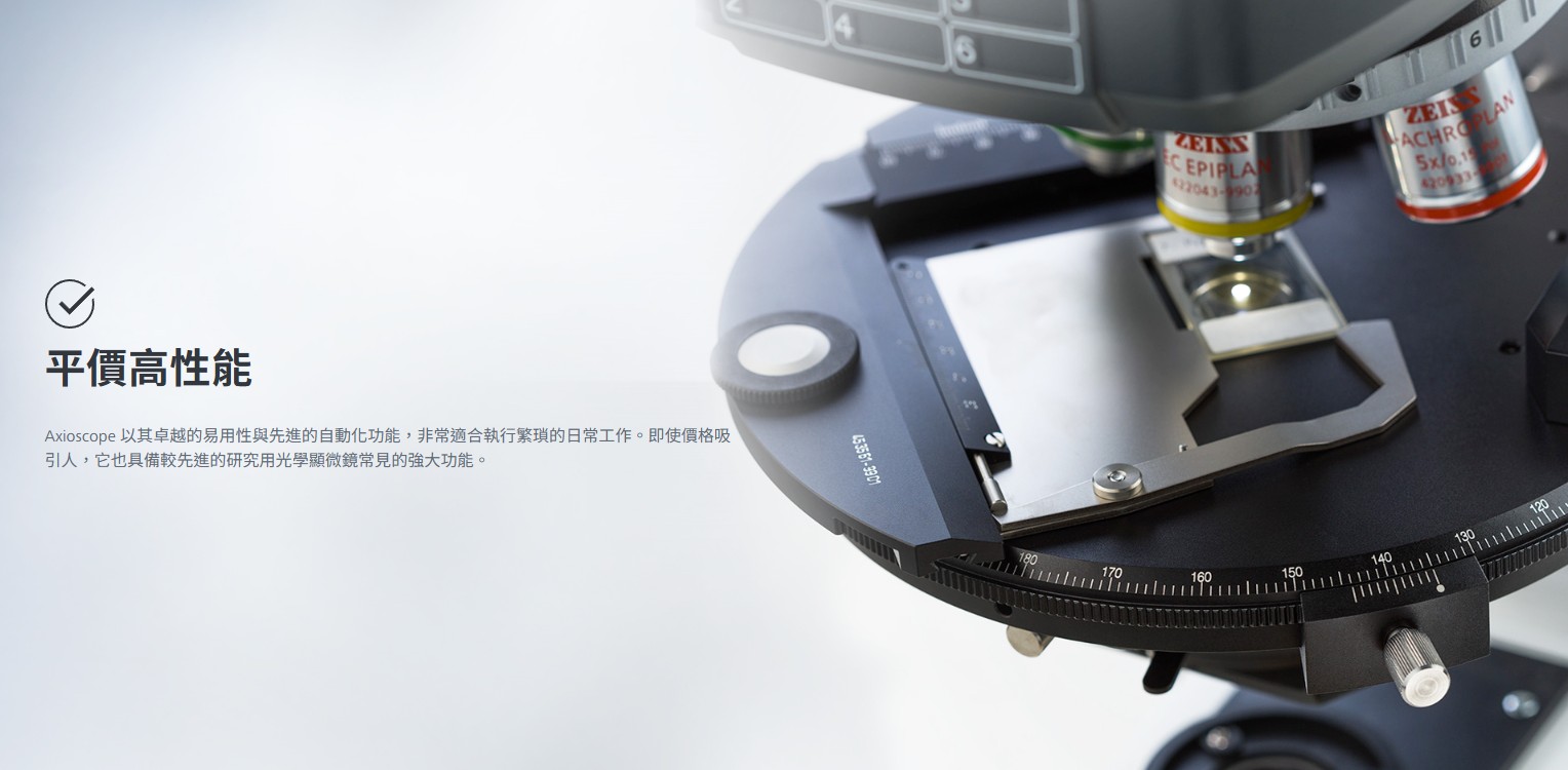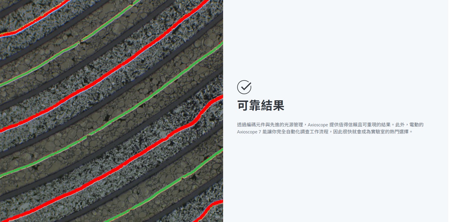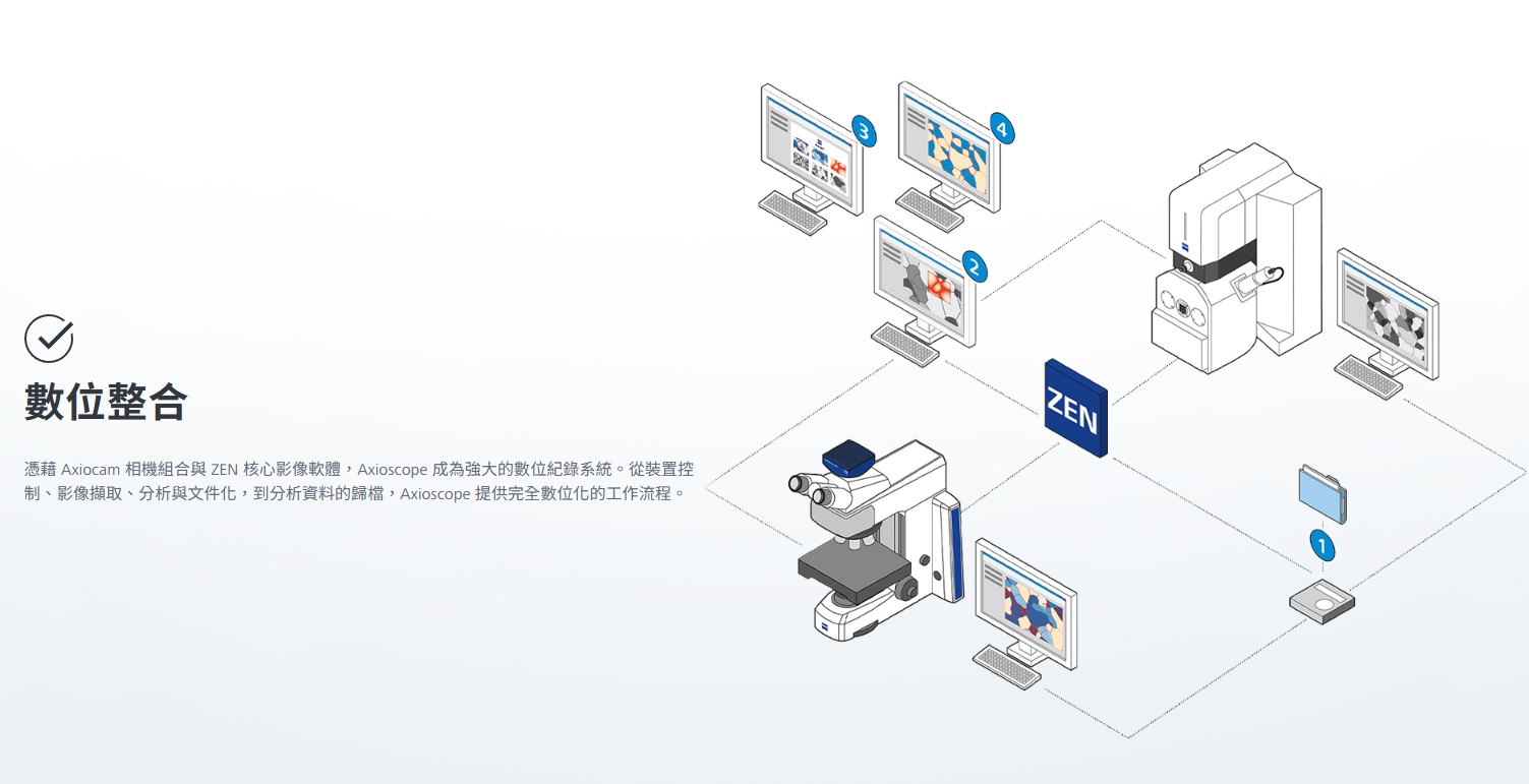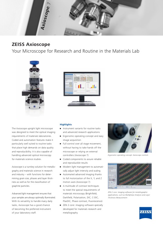 Axioscope 具備性能準備,所有功能協同運作,為材料實驗室提供完整的金相解決方案:相機是數位化樣品資料最重要的介面,具備特定應用特性的透鏡,以及專為材料研究與金相學開發的影像軟體。