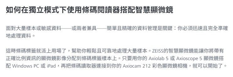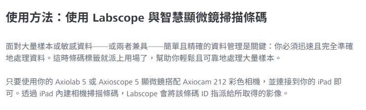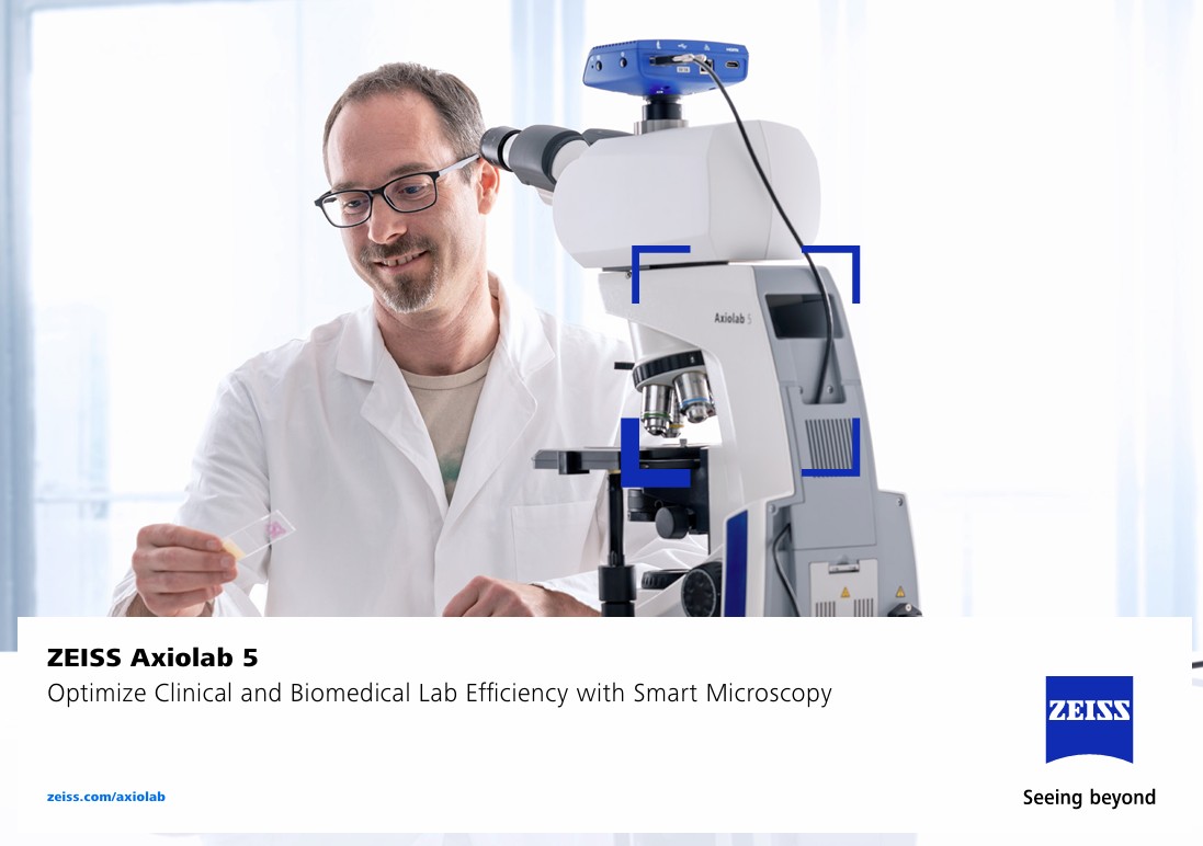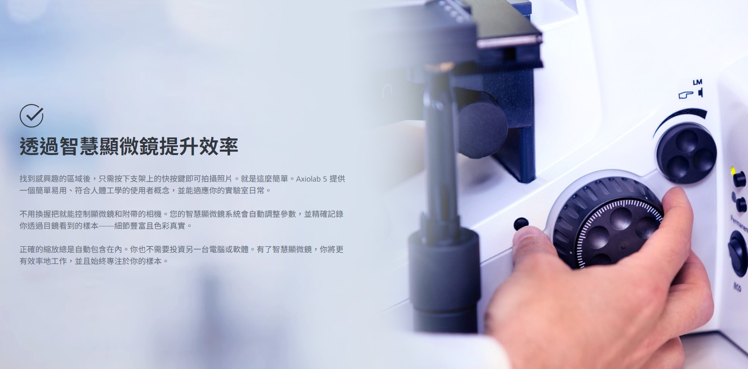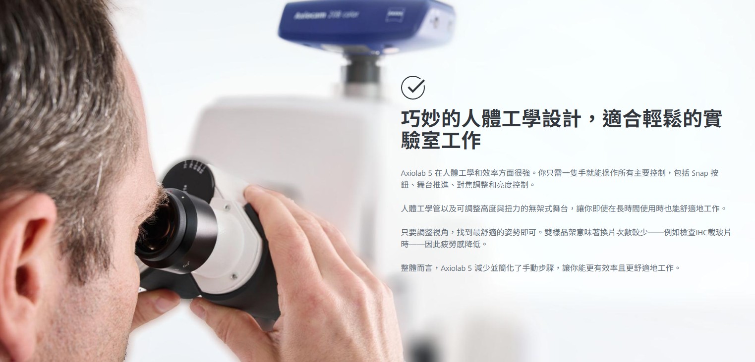 Axiolab 5 滿足您臨床與生物醫學實驗室的嚴格要求,完美結合人體工學設計與速度。利用 Axiolab 5 與顯微鏡相機 Axiocam 212 彩色,享受全新數位紀錄形式。只要聚焦你的樣本,按下一個按鈕,就能獲得真彩色的清晰影像。智慧顯微鏡接手。