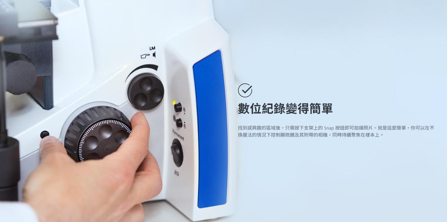 搭配顯微鏡相機 ZEISS Axiocam 208 彩色,您就能充分利用智慧獨立顯微鏡解決方案的優勢。數位文件是系統設計的一部分:只要按下符合人體工學的 Snap 按鈕,你就能完成。相機設定如白平衡、曝光時間及影像增強功能皆為自動完成。無需額外的影像軟體甚至電腦,你就能: