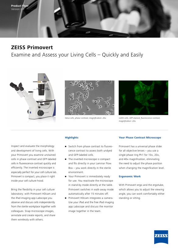 將蔡司Primovert直接放入您的層流箱內。快速且高效地檢查未染色的相位對比細胞及螢光對比下的GFP標記細胞。