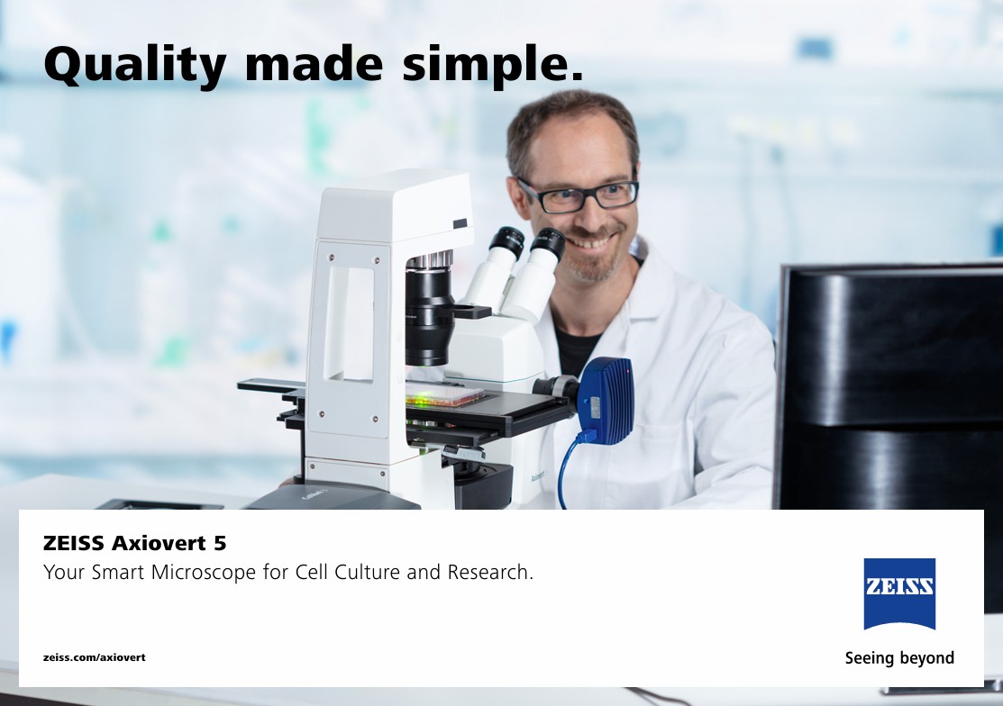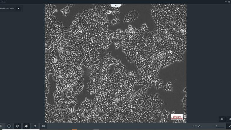 ZEISS Labscope 模組「AI 細胞匯合」與「AI 細胞計數」完美融入您的工作流程。照常檢查你的細胞,然後在細胞培養容器中從一個位置移動到另一個位置時拍一張照片。這些影像會自動分析,您將即時獲得視覺與量化的結果。